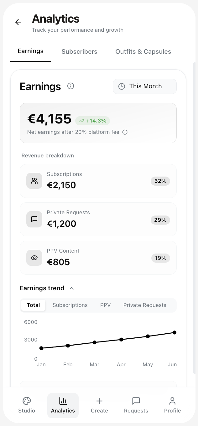 Know exactly what's driving your income. Track granular performance across capsules and outfits: views, PPV unlocks, and Private Request conversion. Instantly see what converts and where your revenue is actually coming from.